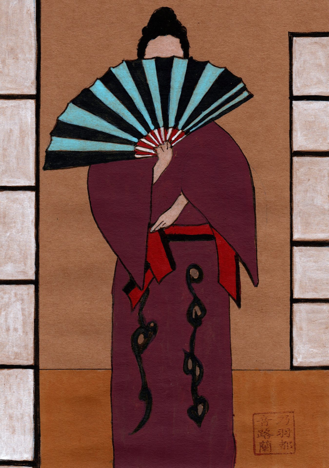 Door Sharon uitgevoerd in een palet van ‘augustus-kleuren’ zoals door Sanzo Wada. De kleuren betreffen: Pale Ecru-Drab, Pale King’s Blue, Grape Green, Pale Methy Blue en Violet Ultramarine.
