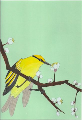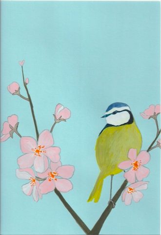 De pimpelmees strijkt neer op een tak van de kersenbloesem. Het moment om de schoonheid van de sakura te bewonderen nu zij zich meer en meer openstelt. De zachte verwondering is volop aanwezig bij deze kleurrijke vogel.